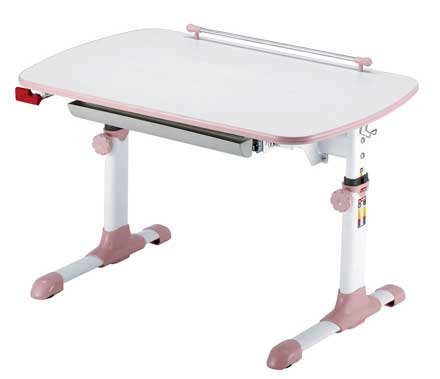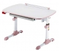 Столешница: ЛДСП 18мм, кромка ПВХ Металлические опоры, покрытые белой эмалью, розовые пластиковые элементы. Изменение высоты (от 57см до 73.5см) и угла наклона (до 18 градусов) столешницы. Ростомер. Выдвижная полка для канцелярских принадлежностей. Размеры (ШхГхВ), см: 94х60х57-73.5 Цвета: Розовый / Молочный