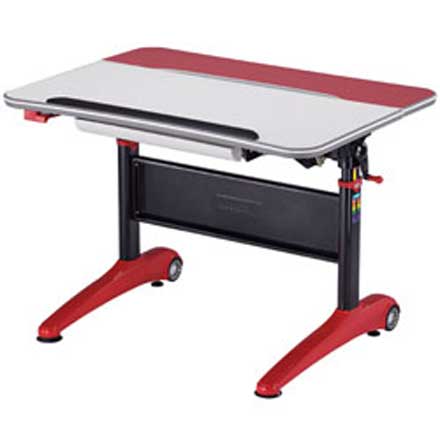 Столешница: ЛДСП 25мм, кромка ПВХ Металлические опоры, покрытые черной и красной эмалью. Изменение высоты (от 62см до 82см) и угла наклона (до 18 градусов) столешницы. Ростомер. Выдвижная полка для канцелярских принадлежностей. Передвигается с помощью колес в опорах стола. Кабель-канал. Размеры: (ШхГхВ): 120х70х62-82см Цвет: Молочный / Красный