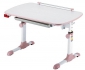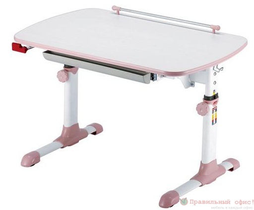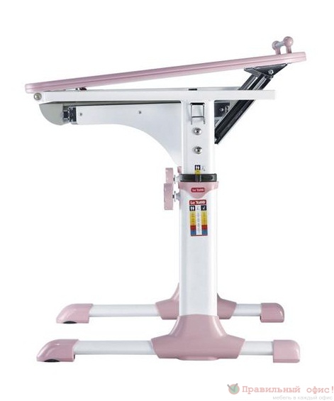 Столешница - ЛДСП 18 мм, кромка ПВХ Металлические опоры, покрытые белой эмалью, розовые пластиковые элементы  Изменение высоты (от 57 до 73.5 см) и угла наклона (до 18 градусов) столешницы Ростомер Выдвижная полка для канцелярских принадлежностей Размеры: (ШхГхВ): 94 х 60 х 57-73.5 см Цвета: Розовый / Молочный