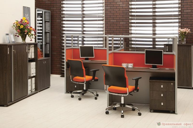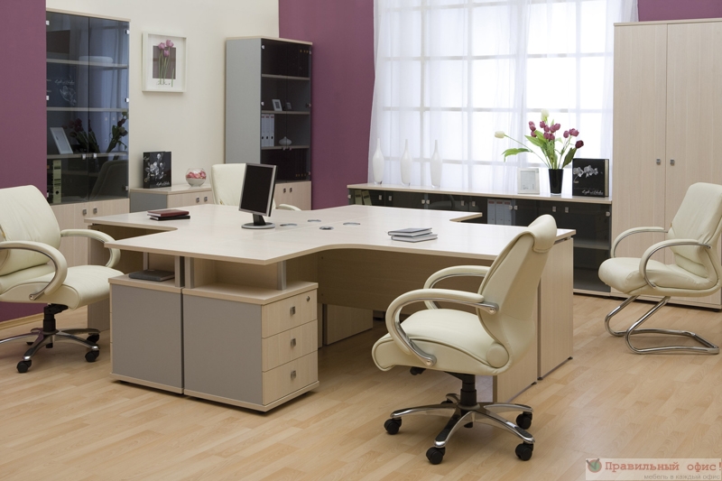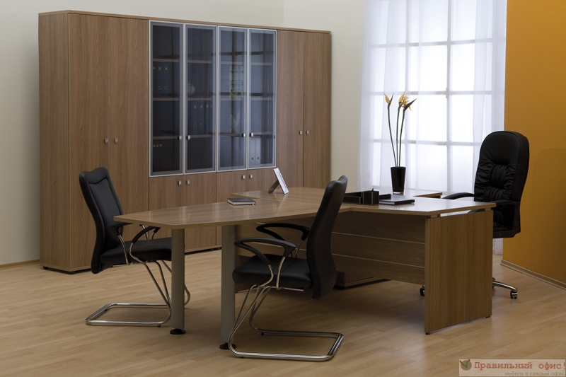 Столы, полностью выполненные из ЛДСП 25мм, и тумбы с оригинальными декоративными элементами придают всему офисному комплекту особый шарм и грациозную монументальность