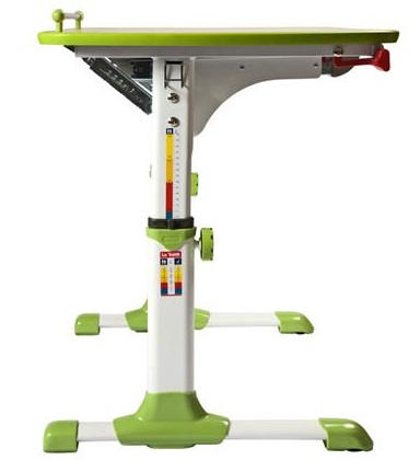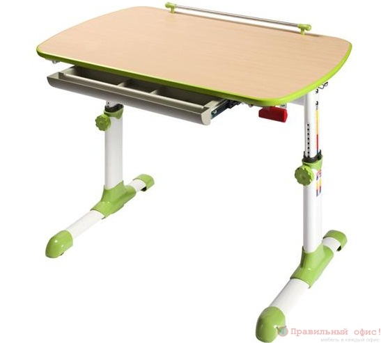 Столешница - ЛДСП 18 мм, кромка ПВХ Металлические опоры, покрытые белой эмалью, зеленые пластиковые элементы Изменение высоты (от 57 до 73.5 см) и угла наклона (до 18 градусов) столешницы Ростомер Выдвижная полка для канцелярских принадлежностей Размеры: (ШхГхВ): 94 х 60 х 57-73.5 см Цвет: Зеленый / Бук